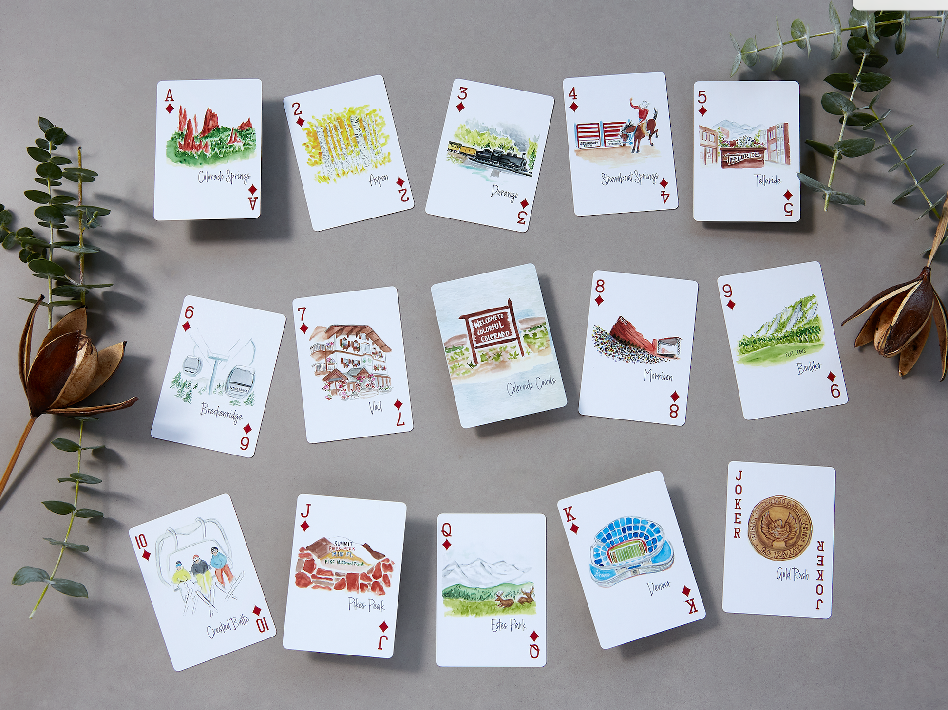 Explore the Centennial State one card at a time! This beautifully crafted deck features original watercolor illustrations of Colorado's most beloved mountain towns, natural wonders, and iconic landmarks. From Red Rocks and Garden of the Gods to Aspen trees and historic Durango, each card captures Colorado's breathtaking beauty. Perfect for game night, collectors, or as a thoughtful Colorado keepsake.