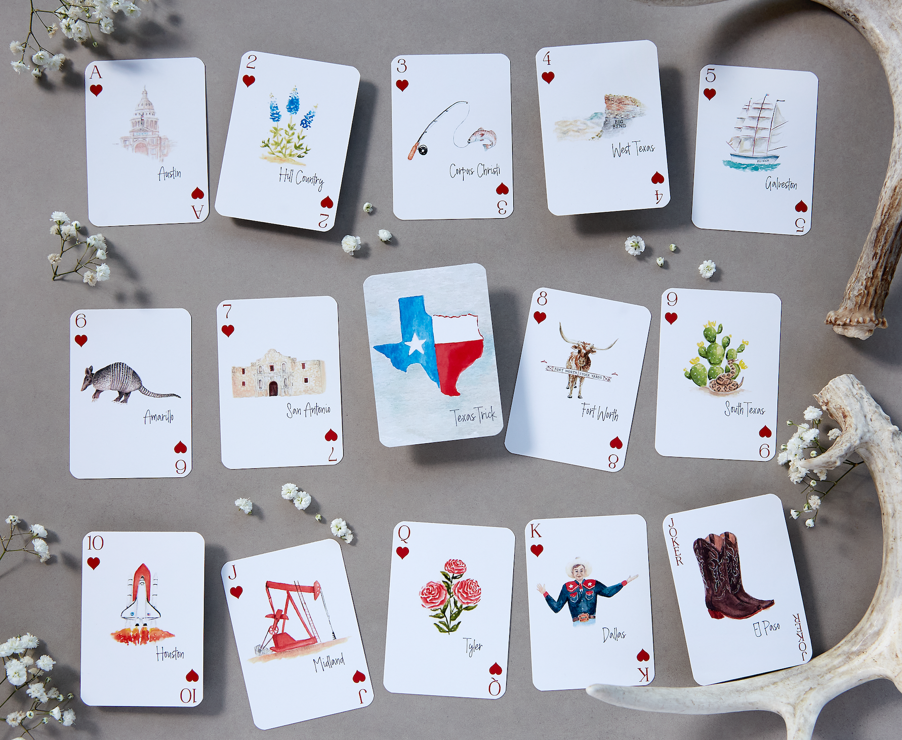 Everything's bigger in Texas—including this deck! This beautifully crafted collection features original watercolor illustrations of the Lone Star State's most beloved cities, symbols, and regional treasures. From the Alamo and bluebonnets to Big Tex and Palo Duro Canyon, each card showcases what makes Texas iconic. Perfect for game night, collectors, or as a thoughtful Texas keepsake.